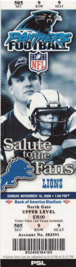 Stadium Review - PantherFanz.net ![]() This weekend, The Buffalo News (my hometown newspaper) ran an article on local fan behavior which explored the "worst behaved" moniker given to Buffalo Bills fans by the Wall Street Journal (I was actually quoted in the piece). Therefore, I found it somewhat ironic that I would be in Charlotte, NC where the fans here were named among the top five "most hospitable" cities in a recent poll by SI.com. Call it southern hospitality or Carolina pride, but I have to concur with the findings of SI.com after spending the day with Dan Ortel and the fine folks at Pantherfanz.net. These guys were more than accommodating to a kid from western New York who just happened to be undercover for the day as a Carolina Panthers fan. As soon as we arrived, there was a genuine sense of family and NFL camaraderie as we were given the Tailgaters tour. Offers for breakfast barbecue and NFL fan chatter poured in as we made the rounds through PantherFanz Central. I got lots of the "Oh, you're that guy," commentary as my Quest for 31 Beer Stein helped spark conversations. ![]() Our hosts from Pantherfanz.net had an impressive setup to say the least. What began with a couple guys burning hot dogs on a single hibachi grill, over the years, has morphed into a full-on tailgating extravaganza. The PantherFanz Party Prowler is easily the centerpiece of the hub of activity that is gameday in the PantherFanz Tailgating lot. Built from a converted school bus, James and boyz have built an exceptional command and ![]() ![]() ![]() As for game itself, we had amazing seats. Perched in the endzone, section 230 next to L.R. and Stevie we watched the Lions roar to a 10 - 0 lead as the Panthers struggled in the first quarter to get going. ![]() For more information on the city of Charlotte, North Carolina check out my other reviews by clicking on the links below: NFL: December 12, 2010 - Atlanta Falcons vs. Carolina Panthers NFL: October 25, 2009 - Buffalo Bills vs. Carolina Panthers NFL: October 29, 2006 - Dallas Cowboys vs. Carolina Panthers NFL: Carolina Panthers, Bank of America Stadium - 2010 Stadium Tour NFL: Carolina Panthers, Bank of America Stadium - 2009 Stadium Tour NBA: Charlotte Bobcats, Time Warner Cable Arena - Arena Tour NBA: Charlotte Bobcats, Time Warner Cable Arena - General Information NHL: Carolina Hurricanes, RBC Center - General Information |