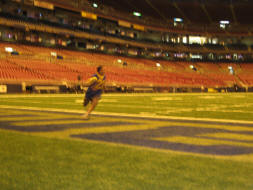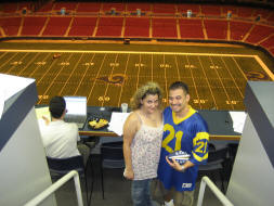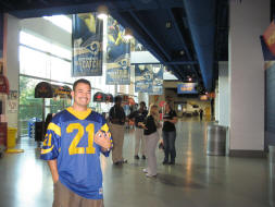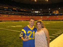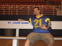 St. Louis makes for a great weekend getaway. I found the downtown area to be clean and safe to walk through at night offering plenty to see and do. After a visit to the Gateway Arch and a complimentary tour of the local Anheuser-Busch Brewery (free samples included), visitors to St. Louis have plenty of options for local restaurants and bars with live St. Louis jazz and blues. We stopped in at BB’s Jazz, Blues, and Soups for a bowl of their chicken gumbo and a sampling of local blues music. LaClede’s Landing, adjacent to the Edward Jones Dome is a thriving bar scene with restaurants, nightclubs, and bars. I highly recommend stopping in at The Big Bang, a dueling piano bar, and then checking out Club Buca for overpriced drinks and eye candy. I was equally impressed with the St. Louis Rams fans and the gameday experience offered in their fair city. Gameday kicks off early on Sunday morning, with tailgaters in the parking lots next to the stadium. Parking is $30.00, but out come the umbrella tents and full sized grills firing up a plethora of cholesterol-laden meats. The local radio stations also host organized tailgating parties next to the stadium with live bands, free giveaways, and a mini-version of the NFL experience. The game itself was an exciting touchdown-fest as the visiting Arizona Cardinals outlasted the hometown St. Louis Rams to post a 34 - 31 victory on the road. Tom came through with excellent seats in section 114 on the 50-yard line. But it seemed that I was seated in a fairly quiet and subdued section of fans, as when I left to answer nature’s call, Crystal overheard some wondering what happened to the “loud guy with the camera”. When I returned, wearing my throwback St. Louis Rams, Lawrence Philips jersey I held out hope that I might see a thrilling come from behind victory, but it was not meant to be. After the game, Crystal and I were invited for a behind the scenes stadium tour including some time down on the field. To get the full Edward Jones Dome FieldTurf experience, I ran my own version of the “Greatest Show on Turf”, running go-routes in the endzone as I caught touchdowns from the golden arm of Tom Schlaker. In the waning moments of the imaginary two minute offense in my head, I went deep and cradled in a remarkable over the shoulder grab which I took 98-yards for an impressive, game winning touchdown a-la Torry Holt (if he were 5’7” with blazing 6.3 40 speed). The experience left me hopped up on adrenaline, and hunched over ready to collapse.