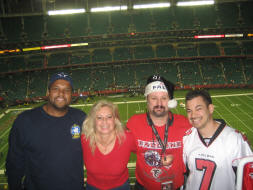 Stadium Review - Crashing Wendy's Tailgating Party ![]() When we were in Tampa watching the Tampa Bay Bucs take on the Atlanta Falcons, we met Atlanta Zeke who assured us that nobody tailgates like his crew of Atlanta Falcons fans back home at the Georgia Dome. The gauntlet had been thrown down, so Jeremy and I took it upon ourselves to personally verify Zeke's claim. Zeke got us tickets in Section 321 on the 50-yard line and a Premiere parking pass ($20) which would open the doors to Atlanta's premiere tailgating experience. Wendy, our tailgate coordinator, quickly introduced us to a mountain of dogs and burgers, salads and deserts (banana pudding), but the main entree was a deep-fried prime rib prepared by Felton. Deep fried in a vat of hot peanut oil and cooked three minutes per pound, Felton assured me that the herbal rub he applied to this delectable delight would be sure to please any pallet. Moist and delicious, I am a big fan of the deep fried prime. As for the game, I pounded as many brews as my bladder would contain during the pregame celebration and stumbled toward the Georgia Dome to watch as the hometown Atlanta Falcons were taking on the Dallas Cowboys. Up the escalator and across the field, the Georgia Dome loomed in distance calling me toward my fantasy football destiny. For you see, it was week two of the playoffs and I would personally be on hand to watch as the Incomparable Mike Vick dropped four touchdowns on my very unworthy opponent, the G-Valley Brigadiers, bringing another victory to my fantasy football team, "The Danger Zone". Michael Vick also eclipsed the mark for most rushing yards in a season by a quarterback on this night... another record setting performance. The game was fantastic and the fans welcomed us with open arms, however I was alarmed by the number of fans in Dallas Cowboys merchandise who turned out in record numbers to watch their beloved Cowboys notch another victory. The