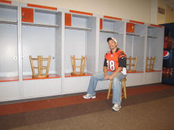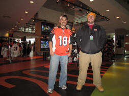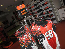 Stadium Review - Paul Brown Stadium Tour The stadium tour begins in the ProShop. The thing I found most remarkable about the Cincinnati Bengals ProShop is that they offer game used player jerseys for general sale. You’re going to pay around $300.00 or more to get your hands on one of these jerseys, but to actually have the ability to purchase a game-used player jersey is rare. So in my estimation, if you purchase one, you’re getting a bargain. The stadium tour continues through the rarely seen player areas such as the weight room, player’s lounge and the locker room areas. The weight room is a state of the art training facility that is on par with the best in the National Football League. The Player’s lounge features recliners, flatscreen TV’s and a pool table. A full service kitchen offering food service throughout the week is also available to Bengals Players, coaches and staff. On non-working days, the Cincinnati Bengals Locker Room is open to the public as part of the stadium tour, but during the season it is the visitor’s locker room that’s patrons will view. Both are interesting, but the home team locker room is obviously more impressive with Bengal carpeting and hardwood player lockers.
