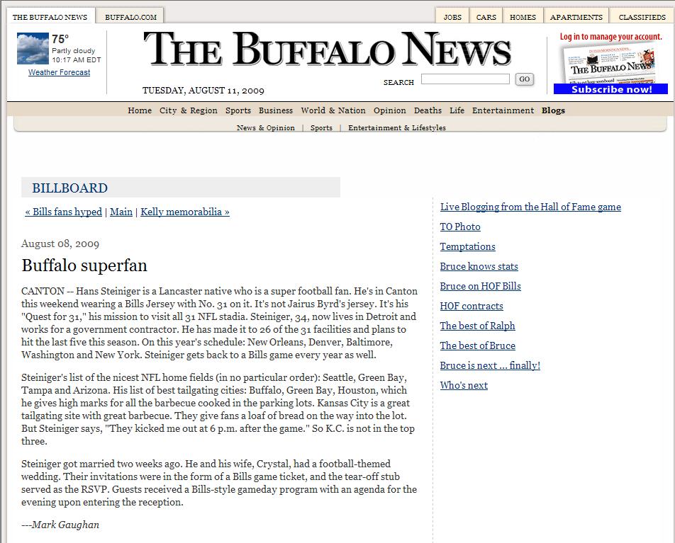 Everyone likes to see themselves in newsprint or on TV and certainly I include myself among those that get a kick out of a little press every once in a while. As I Quest for 31, visiting NFL cities across the country, I'm invariably approached by news media, radio personalities, or other NFL bloggers that are interested in my opinion or interested in having me write a quick entry for their magazine or blog. Some people like to keep a scrapbook of news clippings or an old VCR tape of the time they appeared on the local news, but in this day an age of digital media, I think this is a much slicker approach. Below you will find links to all types of media stories, interviews and articles. Feel free to check them out by clicking on the links below. |