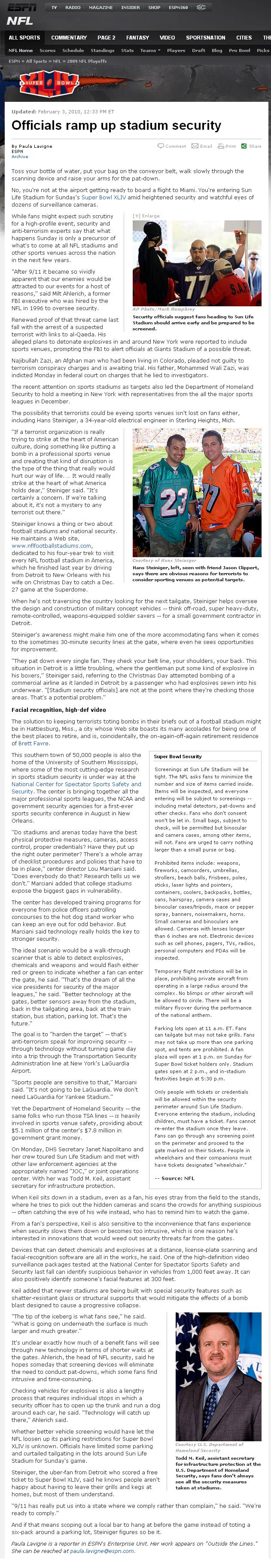 ![]() ESPN.com February 3, 2010 Officials Ramp Up Stadium Security by: Paula Lavigne ESPN.com |