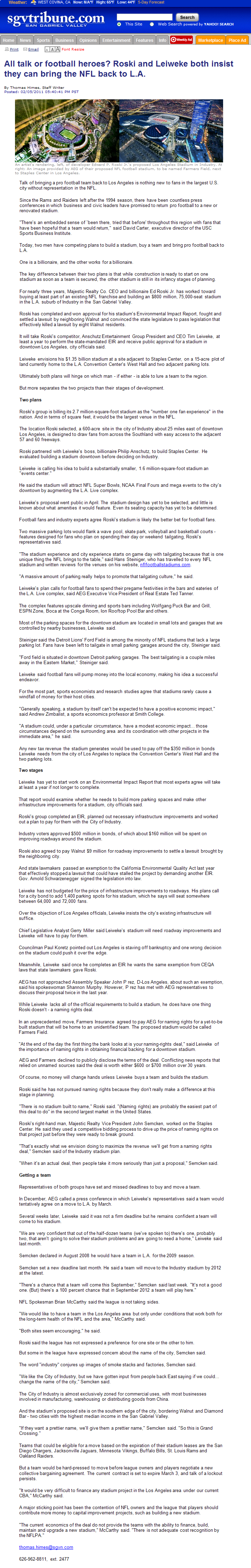 ![]() svgtribune.com February 5, 2011 All Talk or Football Heros? Roski and Leiweke both insist they can bring NFL back to LA by: Thomas Himes Staff Writer |
